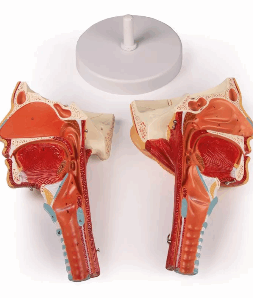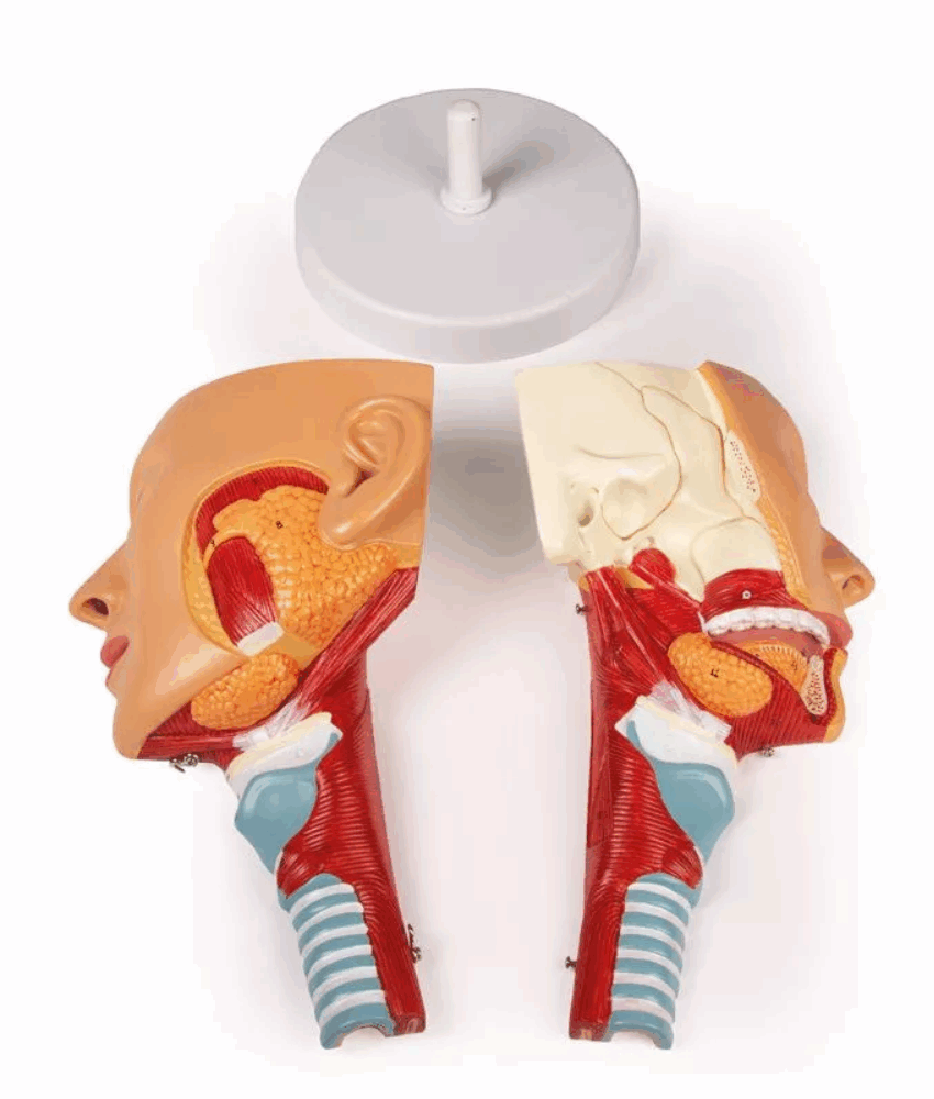Produzido em PVC rígido e atóxico, o modelo apresenta coloração realista, com pintura manual que destaca as diferentes estruturas anatômicas. A divisão em duas metades facilita o estudo das relações espaciais entre as estruturas craniofaciais e do trato respiratório superior.