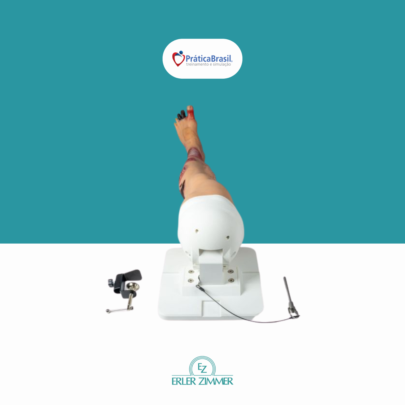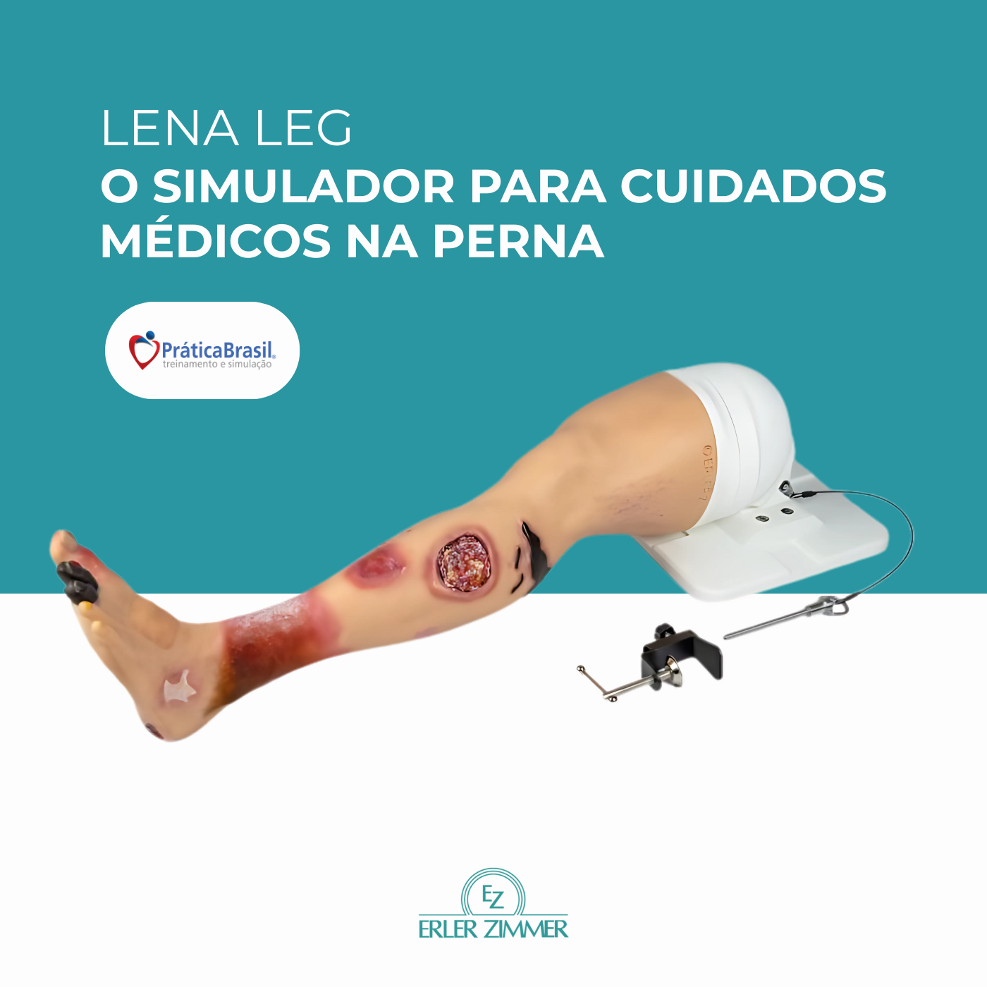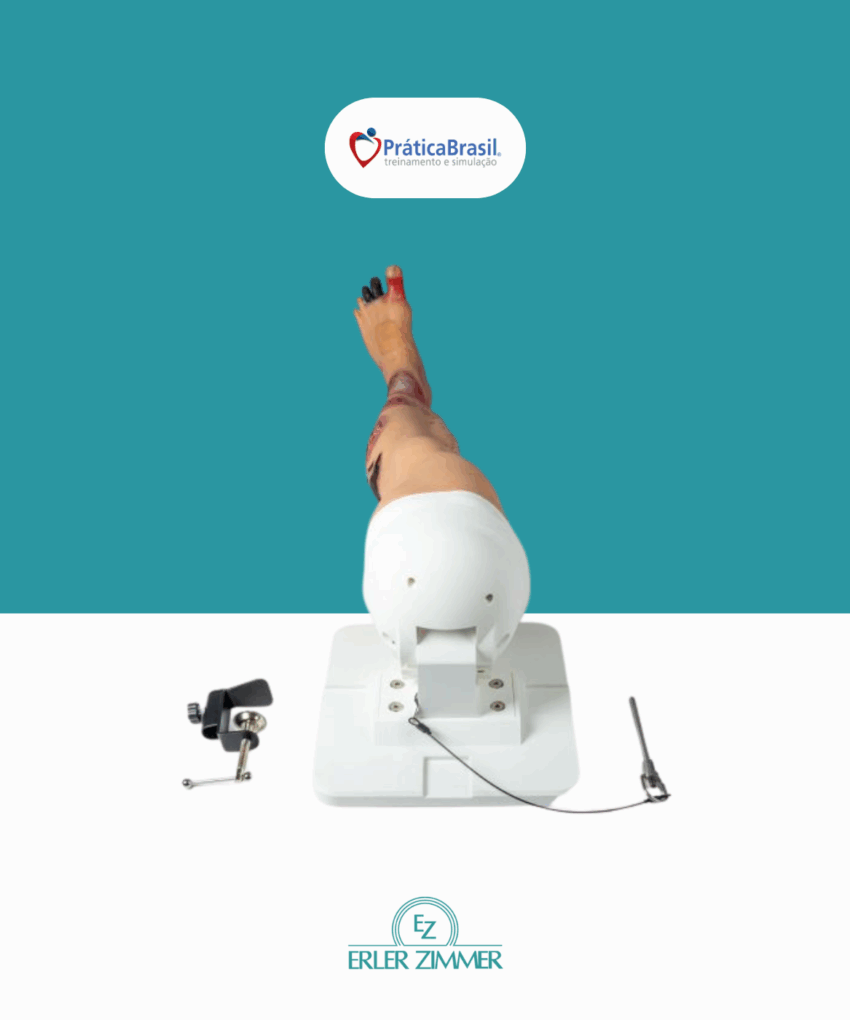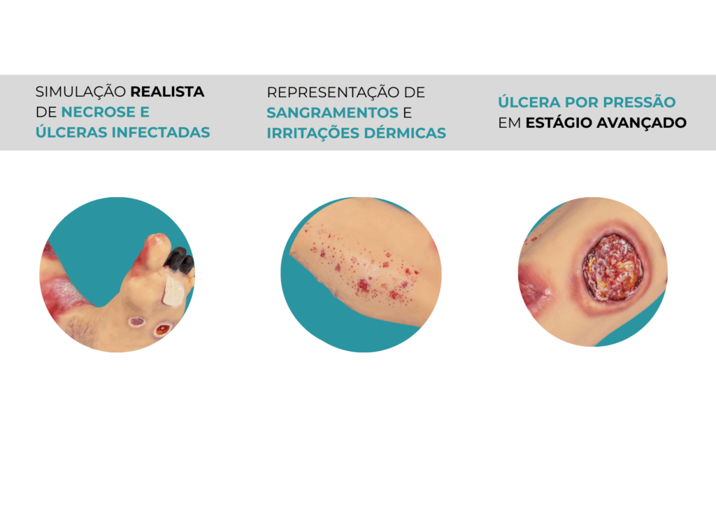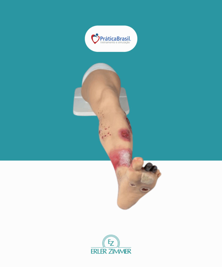 Simulador para educação médica e treinamento, voltado para avaliação visual e distinção de diversas patologias e tipos de feridas na perna. Abrange desde o pé até a metade da coxa.