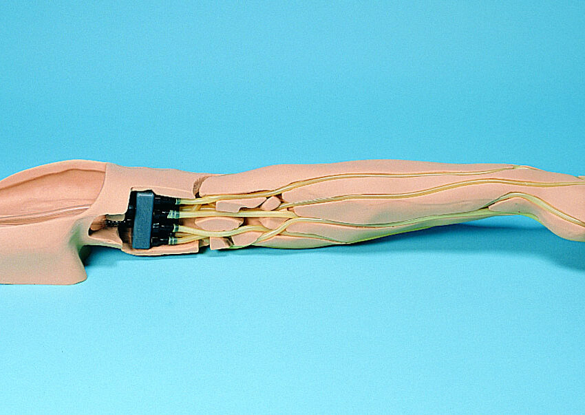 O braço apresenta um extenso sistema vascular de 8 linhas, possibilitando a prática de punção venosa em todos os locais primários e secundários, incluindo o início de IVs e a introdução de cateteres Over the Needle. Um único saco de fluido externo fornece sangue artificial a todas as veias simultaneamente, tornando a instalação prática e eficiente.