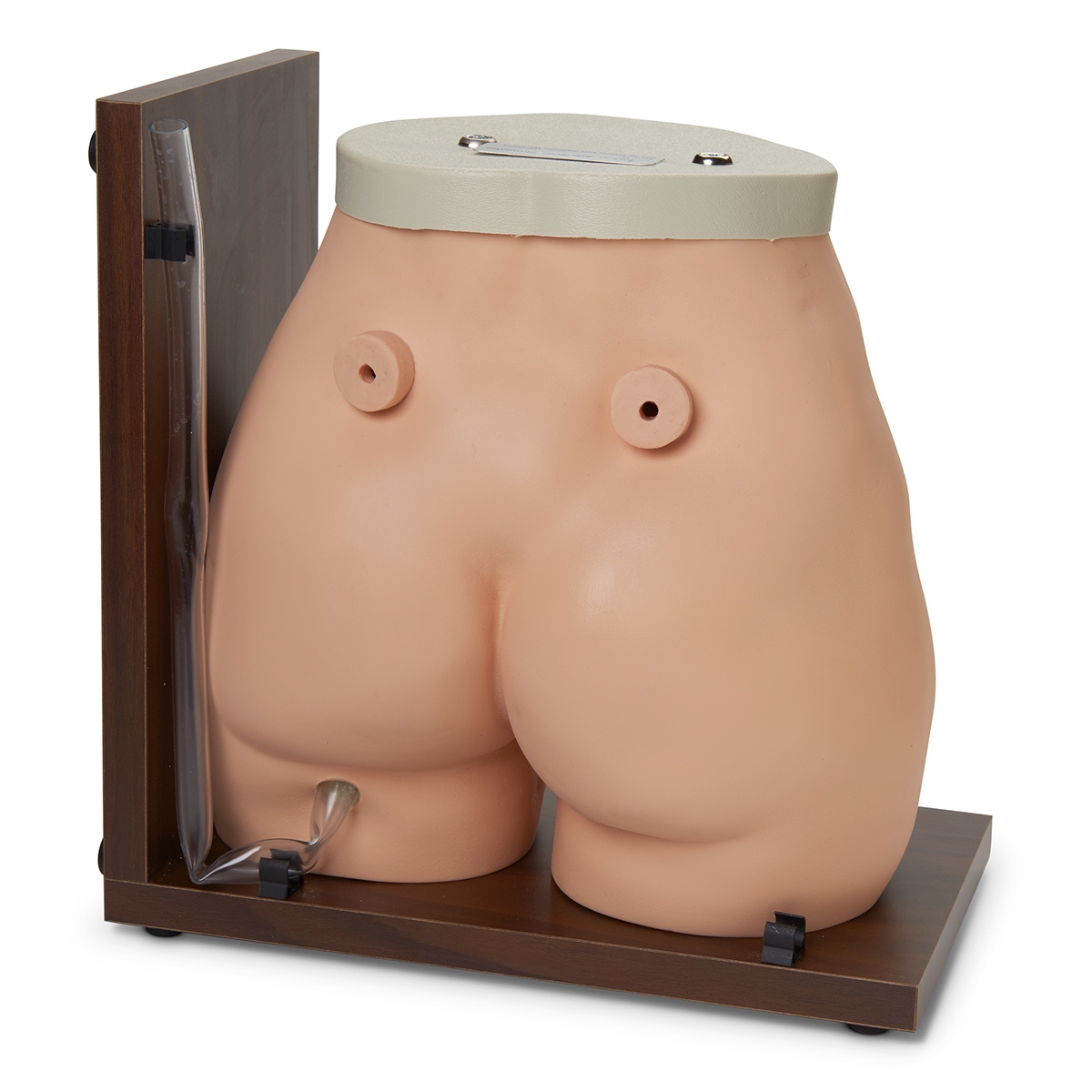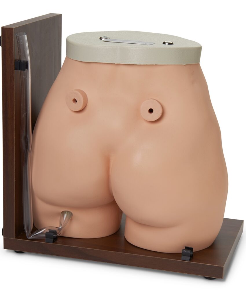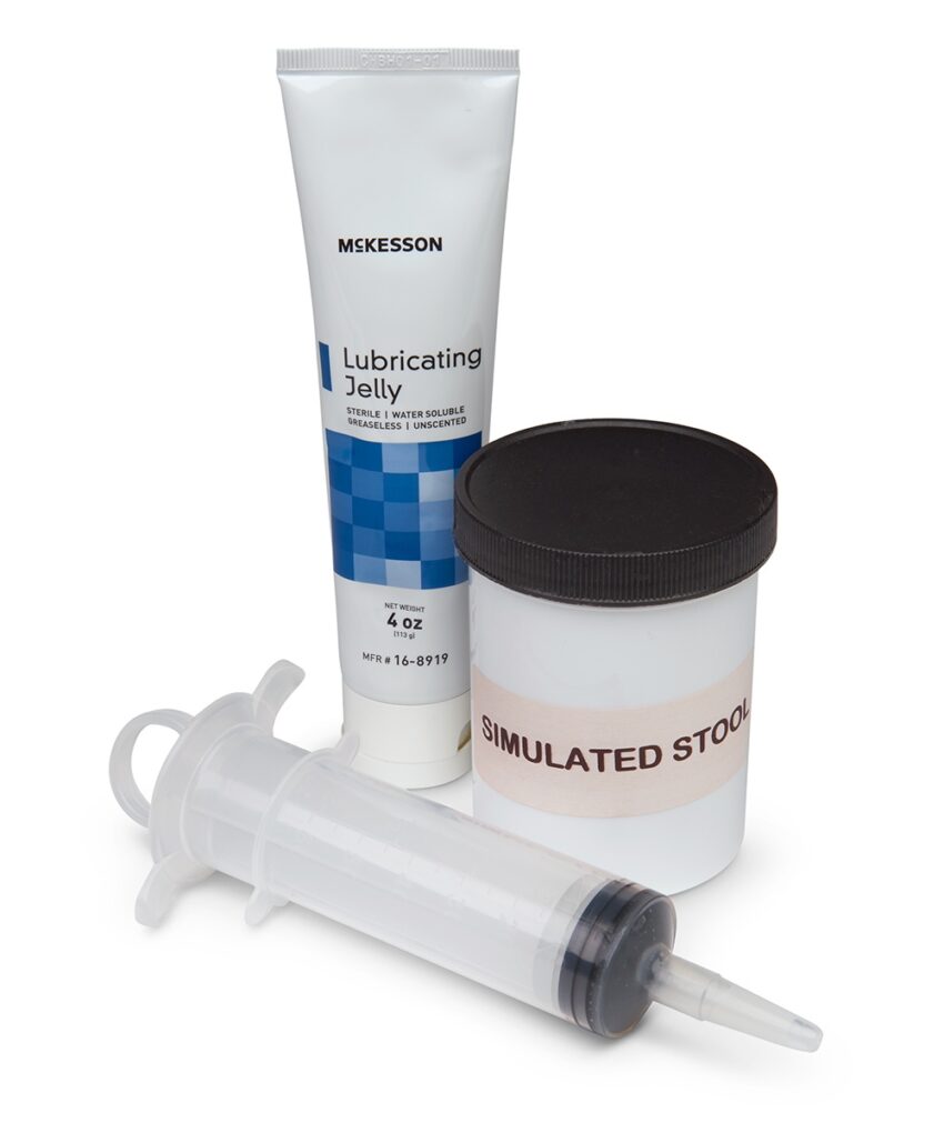 - Seringas são incluídas para bombear materiais através da unidade para fornecer drenagem e excreção na ileostomia e colostomia. As seringas são inseridas através das portas na parte traseira do simulador. Um deles bombeia a ileostomia com água limpa ou água pintada para realismo exato, e a outra seringa bombeia fezes sintéticas para a colostomia.