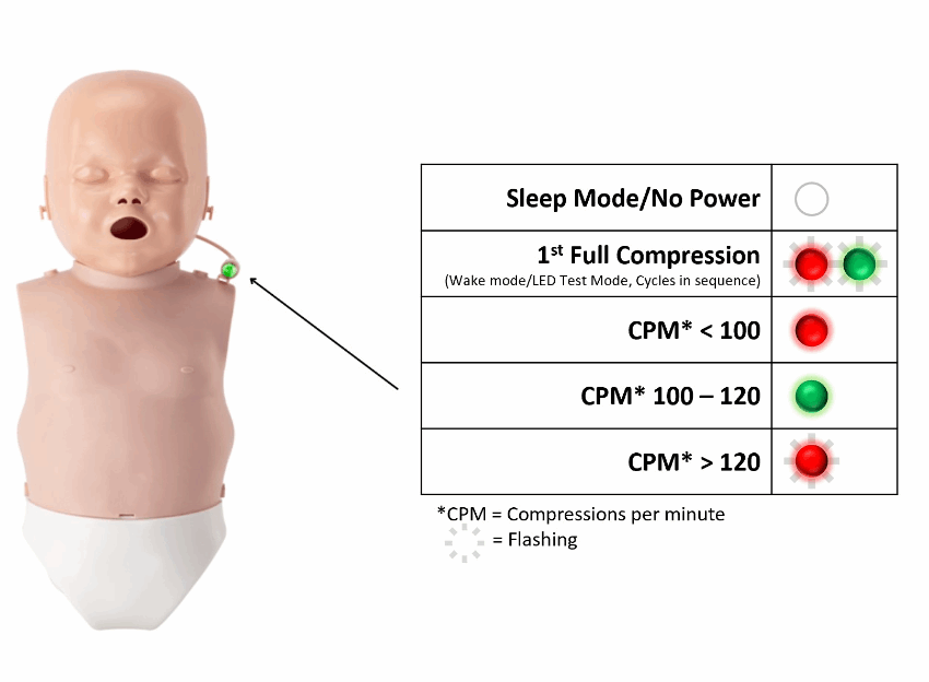 Kit com 12 (código PP-IULM-1200M) doze (12) Manequins Infantis Ultralite com Feedback de RCP (duas (2) pilhas AAA necessárias para cada manequim, não incluídas), um (1) estojo de transporte de náilon, três (3) pacotes com 50 unidades cada de protetores faciais/pulmões para o Manequins Infantis Ultralite
