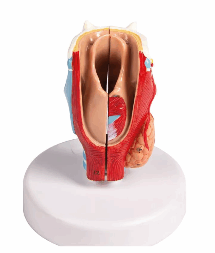 A divisão em duas partes destacáveis possibilita a visualização tridimensional e individualizada dos principais componentes que compõem a laringe. Cada peça apresenta pintura manual com cores anatômicas realistas, facilitando a identificação das estruturas e suas inter-relações.
