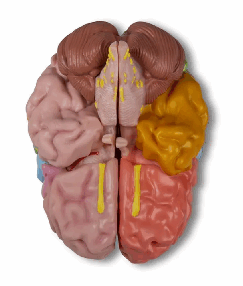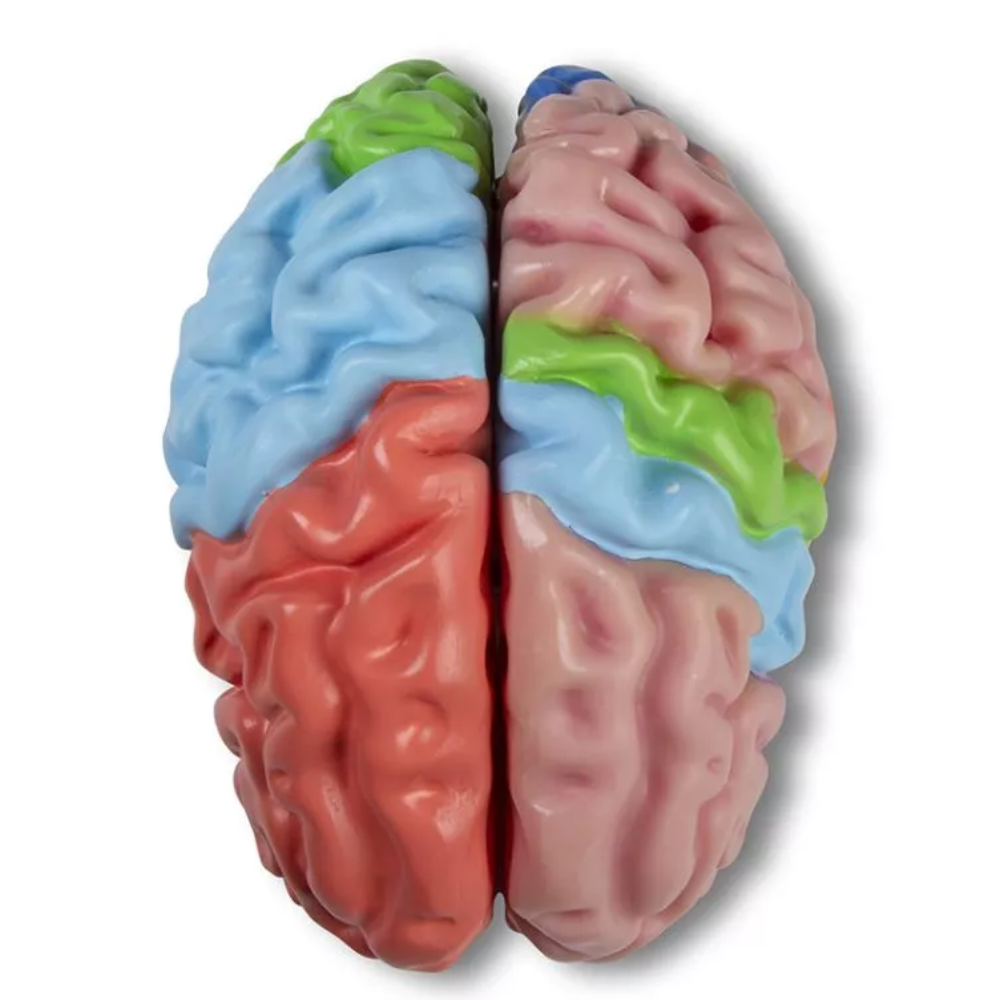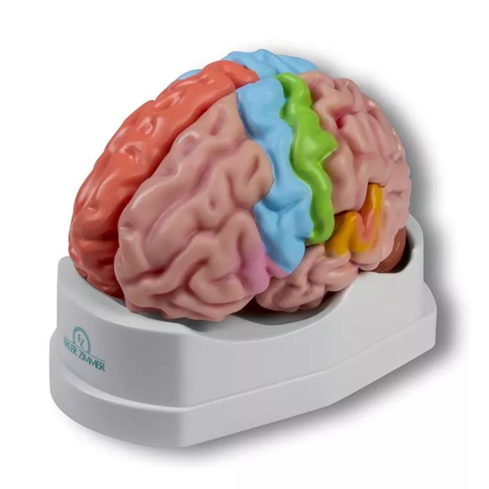 Realismo anatômico: Pintura manual detalhada realça giros, fissuras e zonas funcionais, ideal para estudo de neuroanatomia e cortesia regional.