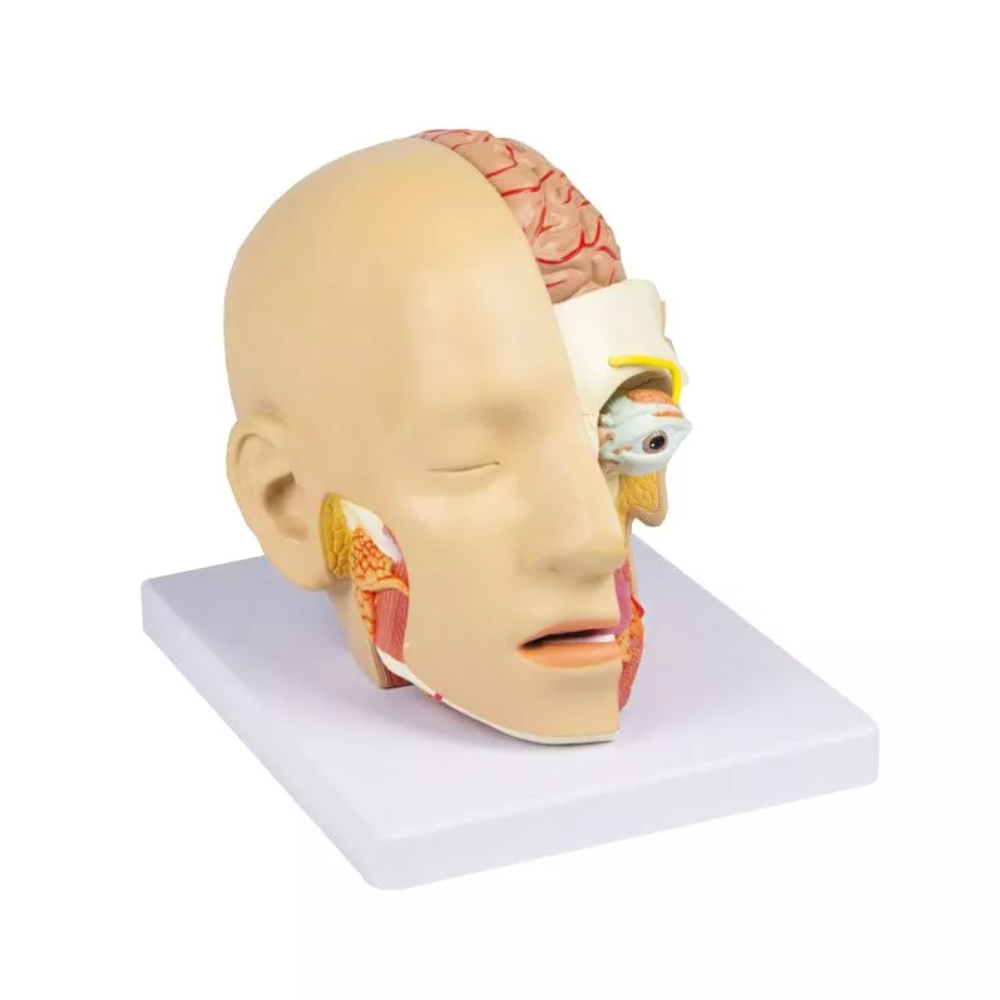 Modelo tridimensional da cabeça humana, seccionada medialmente para permitir observação de estruturas profundas do crânio, encéfalo, cavidades nasal e oral, glândulas e músculos. Acompanha versão em 4 partes que se separam lateralmente, incluindo hemisfério cerebral e base com osso esfenoide exposto. -