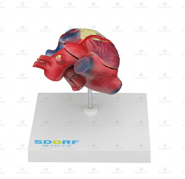 Modelo anatômico patológico do coração com hipertrofia em duas partes, confeccionado em resina plástica com pintura feita à mão e cores realísticas para facilitar o estudo da anatomia e patologia deste órgão;