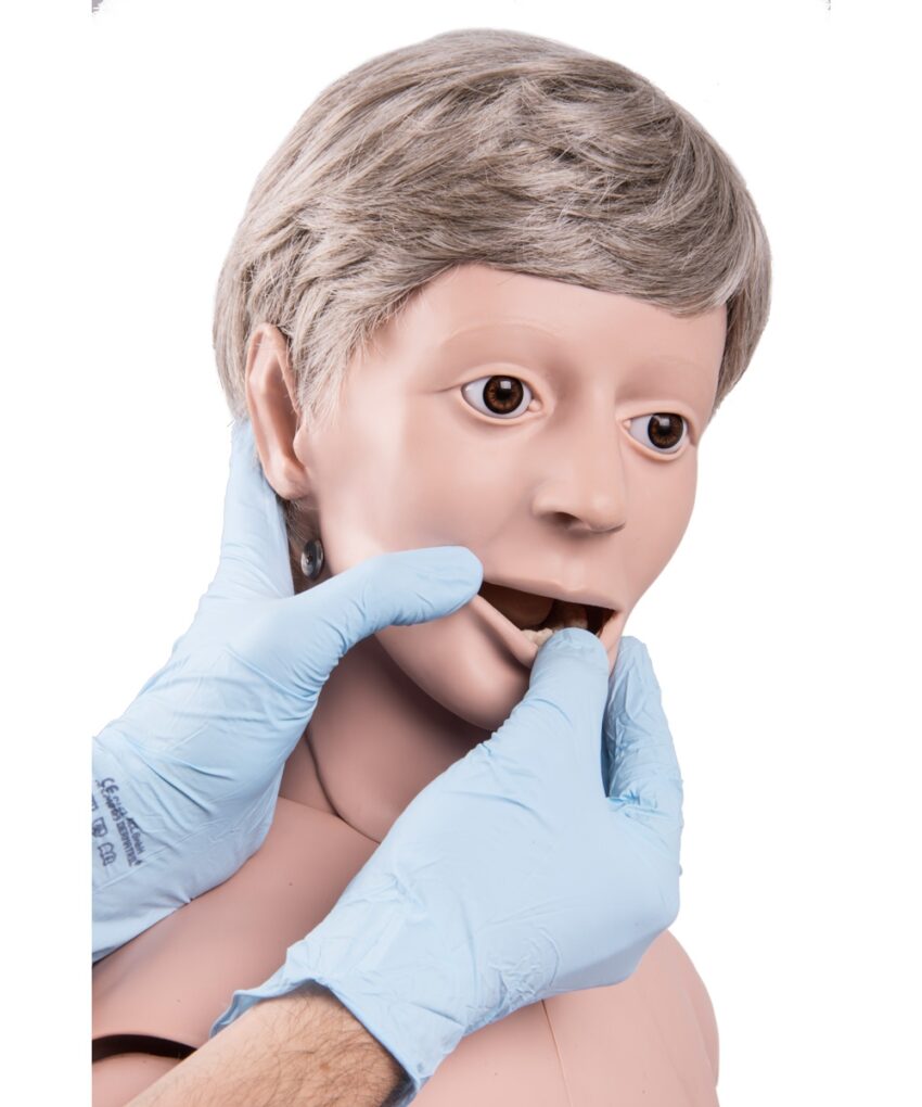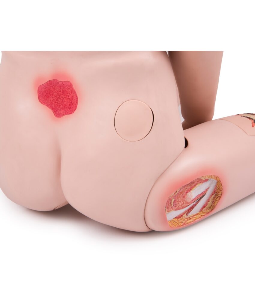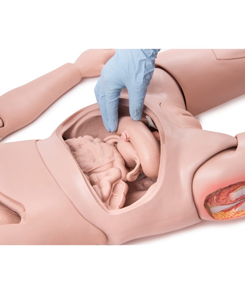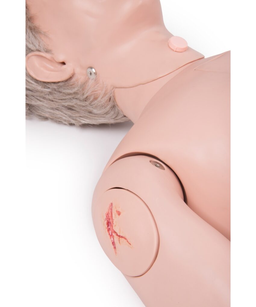 Nosso simulador para cuidados com paciente mais vendido permite a prática da maioria das aplicações de treinamento, desde enfermagem básica até o mais avançado treinamento clínico e de emergência. Feito em plástico durável, inquebrável e à prova d’água, é também flexível, permitindo movimentos naturais dos braços, pernas e juntas. A cintura flexível permite ao manequim permanecer na posição sentada. As seções de pulmão, coração, estômago, bexiga e intestino são removíveis e adaptáveis com vedação da drenagem para facilitar a limpeza. A bexiga e a seção intestinal são absolutamente livres de vazamentos e são conectadas a genitália externa para permitir a cateterização. Todos os locais habituais para a aplicação de injeções possuem almofadas especiais (6 ao todo) que permitem repetidas aplicações e anos de uso. Também está incluída a simulação de um coto de amputação para prática de técnicas de curativo. Para completar esse modelo, talco, vaselina e lubrificantes são fornecidos. De acordo com as normas da OBRA.