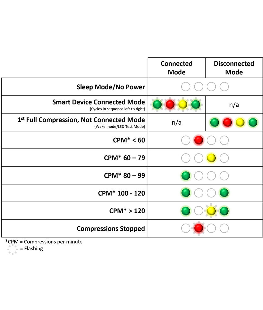 - As luzes sinalizam continuamente a progressão da taxa, confirmando que as compressões estão dentro da faixa de 100-120 cpm recomendada pelas Diretrizes da Indústria