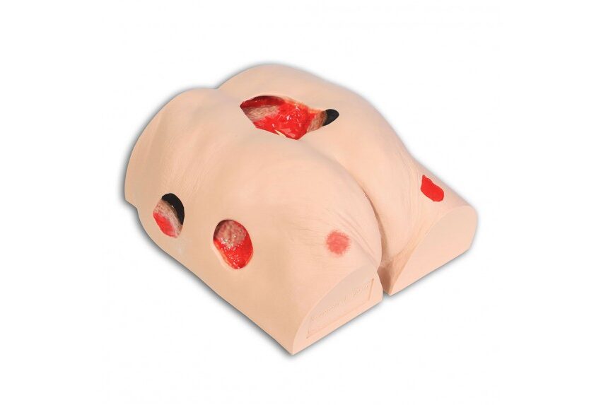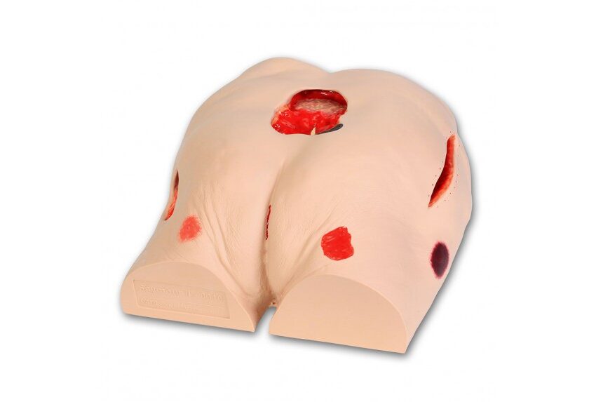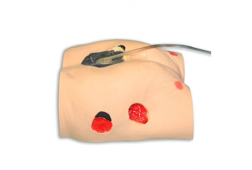 - O Estágio 3 e o Estágio 4 são posicionados de modo que um curativo “em ponte” para uso com dispositivos de terapia de ferida com fechamento assistido a vácuo e pressão negativa possa ser demonstrado e praticado. Este modelo permite visualizar e compreender as diferenças nas feridas. Uma ótima ferramenta para treinamento, testes de competência, avaliação de habilidades, técnicas de curativos e uso de dispositivos de terapia de ferimentos por pressão negativa! Estojo de transporte opcional disponível: 0901