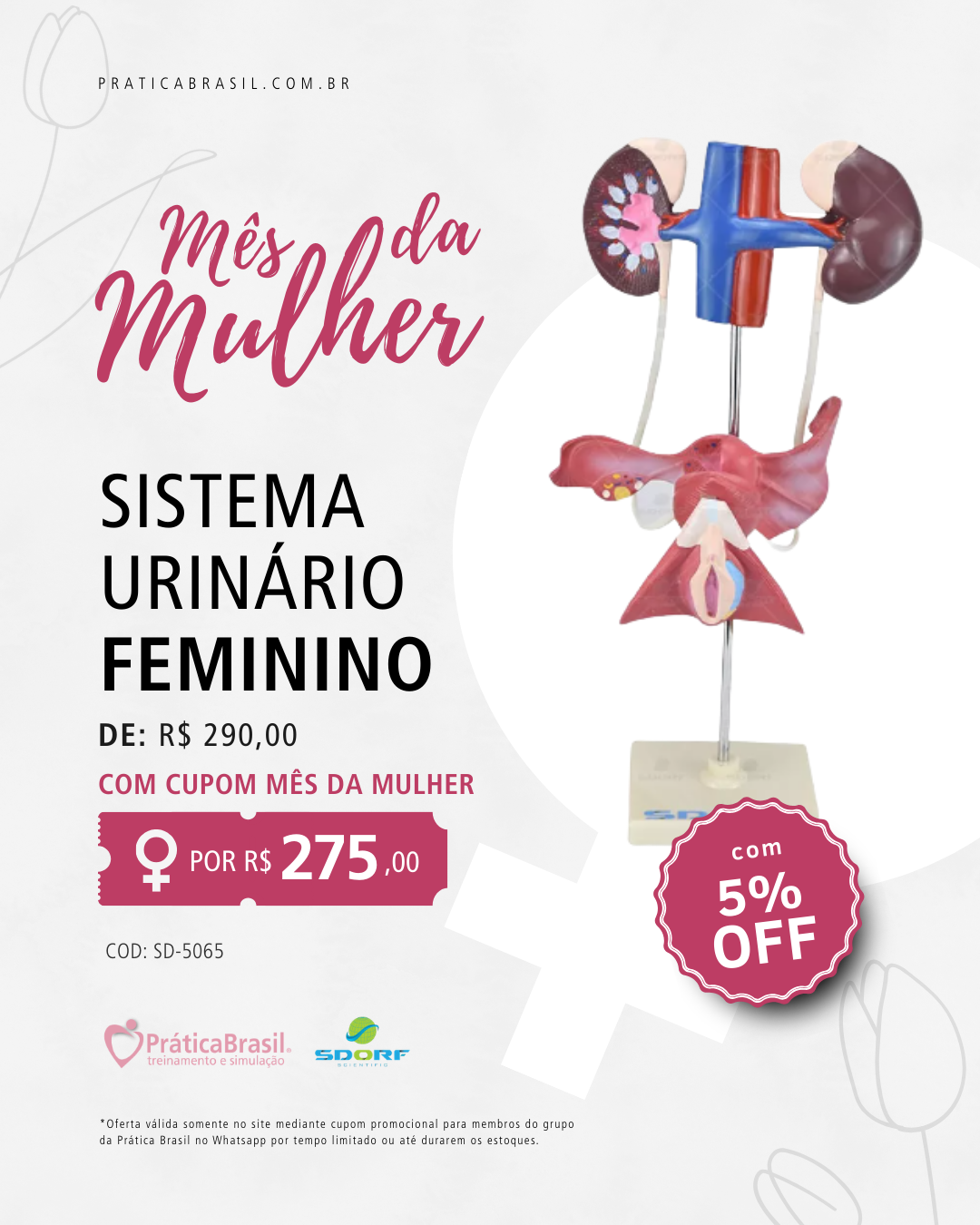 Modelo anatômico do sistema urinário feminino, confeccionado em PVC e resina plástica emborrachada e com pintura feita a mão e cores realísticas;